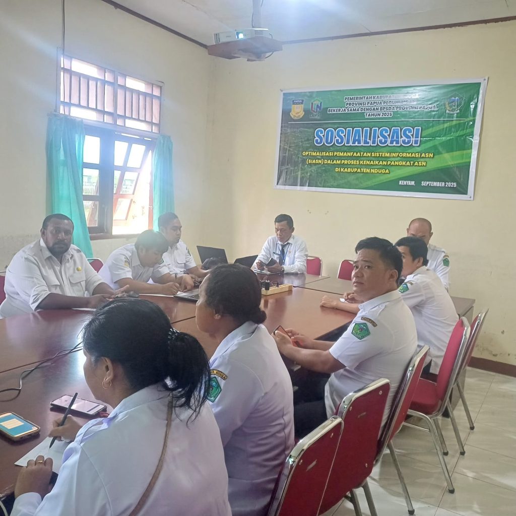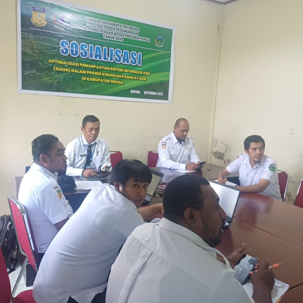 Pemerintah Kabupaten Nduga melalui Badan Kepegawaian dan Pengembangan Sumber Daya Manusia (BKPSDM) Nduga bekerjasama dengan BPSDA Provinsi Papua menggelar Sosialisasi Optimalisasi Pemanfaatan Sistem Informasi ASN dalam Proses Kenaikan Pangkat ASN. Kegiatan ini dibuka secara resmi oleh Inspektur Pembantu IV, Johanis M.Fransiscus Nono Moi,S.Pd dan dilaksanakan tanggal 10 September 2025 berlangsung di ruang Rapat Inspektorat Kabupaten Nduga serta diikuti oleh SKPD lingkup Kabupaten Nduga