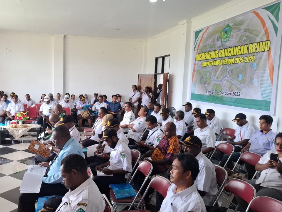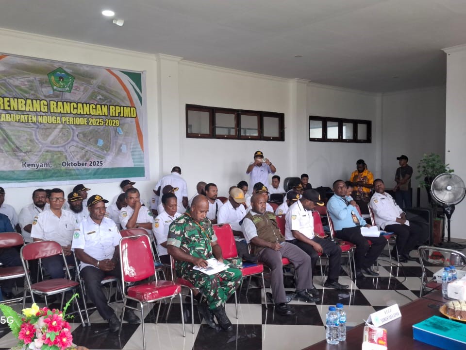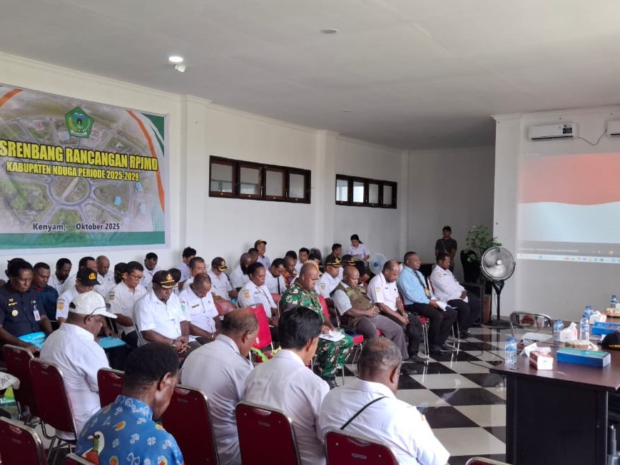 Pemerintah Kabupaten Nduga melalui Badan Perencanaan Pembangunan Daerah, Penelitian dan Pengembangan Daerah (Bappelitbangda) menggelar Musyawarah Perencanaan Pembangunan (Musrenbang) untuk penyusunan Rencana Pembangunan Jangka Menengah Daerah (RPJMD) 2025-2029. Musrenbang dibuka oleh Plt. Bupati Nduga, Yoas Beon,S.Ip (Rabu,8 Oktober 2025) dan dilaksanakan di Ruang Kantor Bupati serta dihadiri oleh seluruh pimpinan OPD, Kepala Distrik dan berbagai pemangku kepentingan pembangunan daerah.