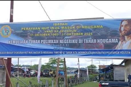 Plt. Bupati Nduga Yoas Beon,S.Ip menghadiri Acara Puncak Perayaan HUT HUT Injil masuk di Ndugama yang ke-62 Tahun,(Kenyam31 Oktober 2025). Acara puncak ditandai dengan meyelenggarakan Ibadah bersama, dipusatkan di kantor Klasis Kingmi Keneyam, dihadiri berbagai Tokoh-tokoh Gereja dari Kordinator Sinode GKIP KINGMI Papua dan Ketua Wilayah IV GKII serta pengurus, GKI, Baptis dan GPDi. Hadir dalam acara ini Anggota DPRD Nduga, Tokoh Masyarakat, tokoh Perempuan dan Pemuda serta seluruh warga jemaat dari berbagai denomininasi gereja yang ada di Kenyam.