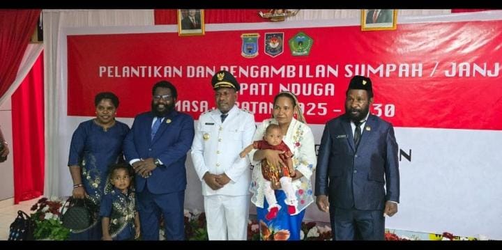 Yoas Beon,S.Ip resmi dilantik menjadi Bupati Nduga oleh Gubernur Provinsi Papua Pegunungan Dr John Tabo, SE, MBA, Selasa (30/12/2025) di Gedung Otonom-Wamena.